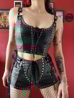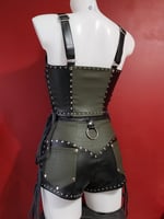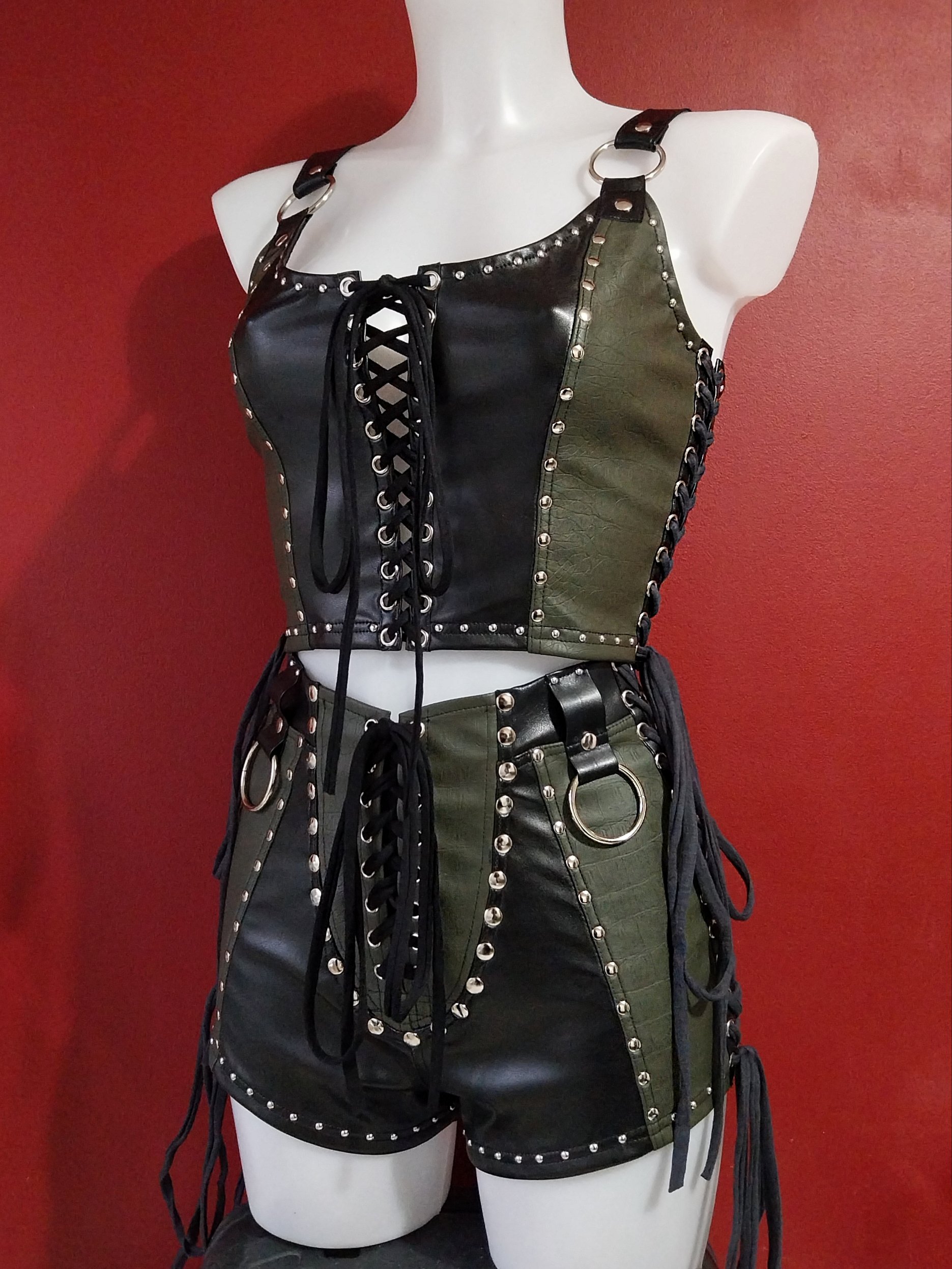 Black faux leather and khaki green croc-embossed faux leather bustier. Silver hardware detailing.