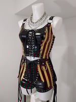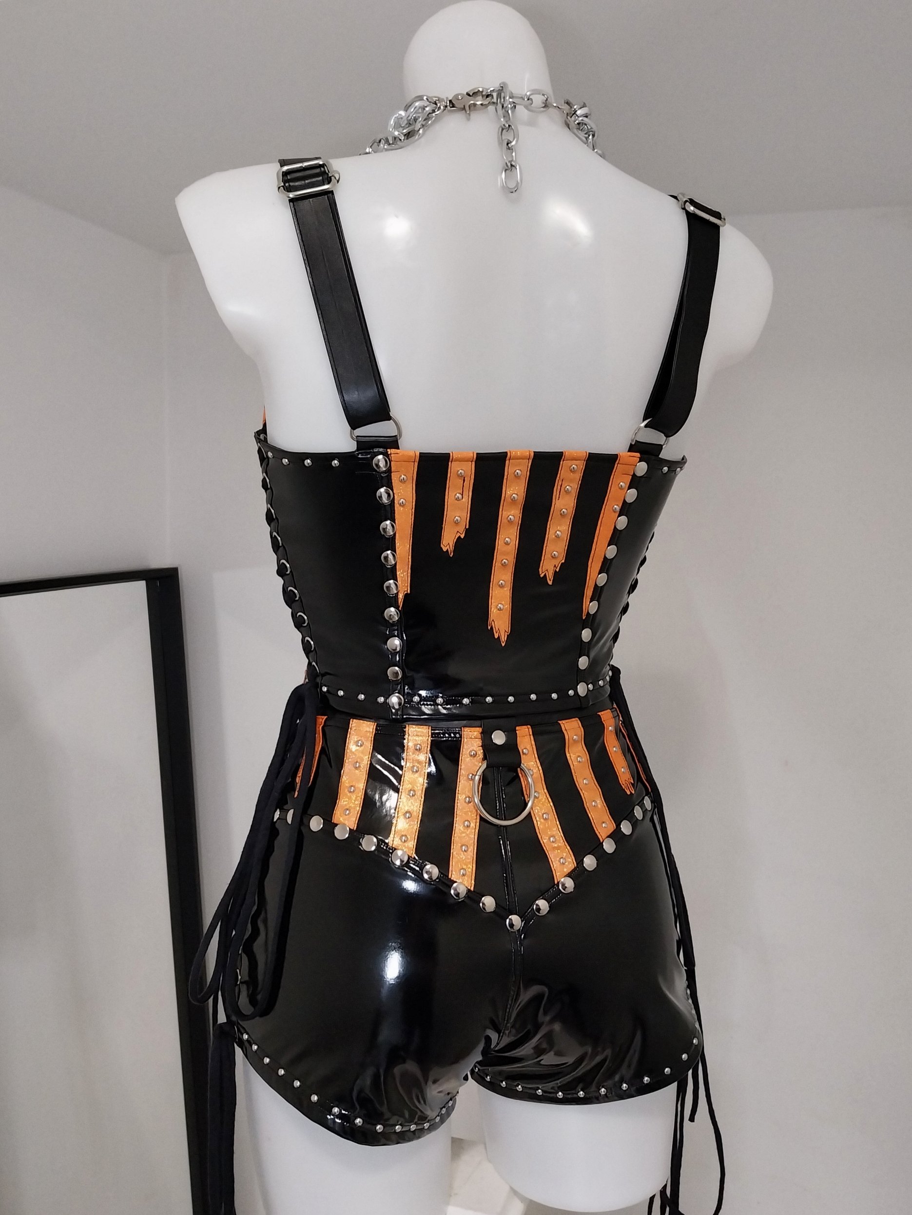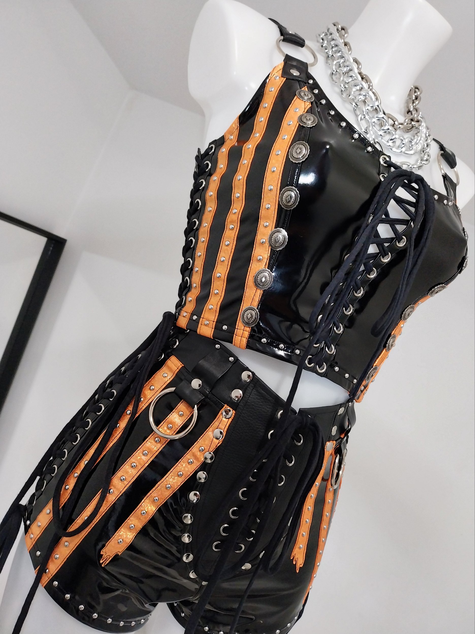 Black supershine vinyl spandex shorts with orange sparkle spandex stripes, and silver hardware detailing.