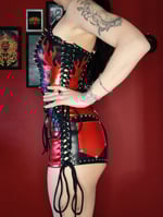 Black faux leather shorts with red foiled spandex flame detail, back pockets, and back yoke. Silver coloured hardware detailing. Lined.