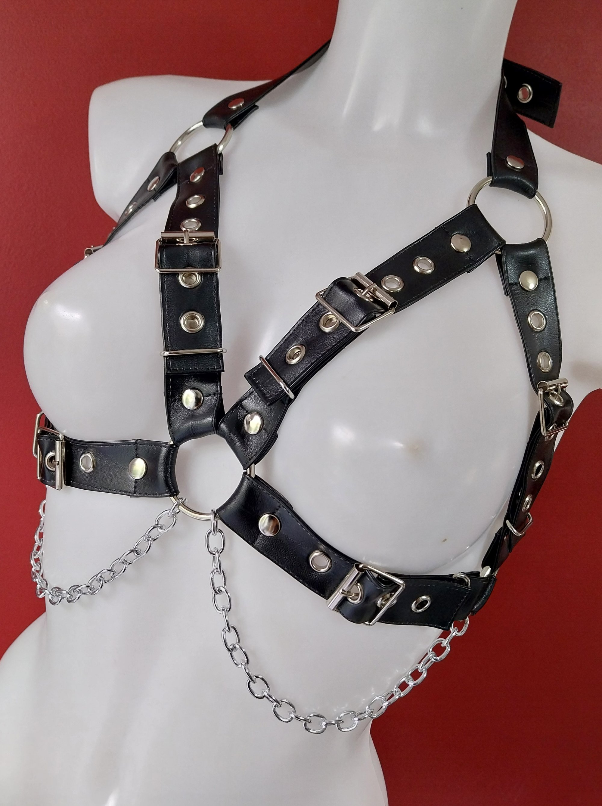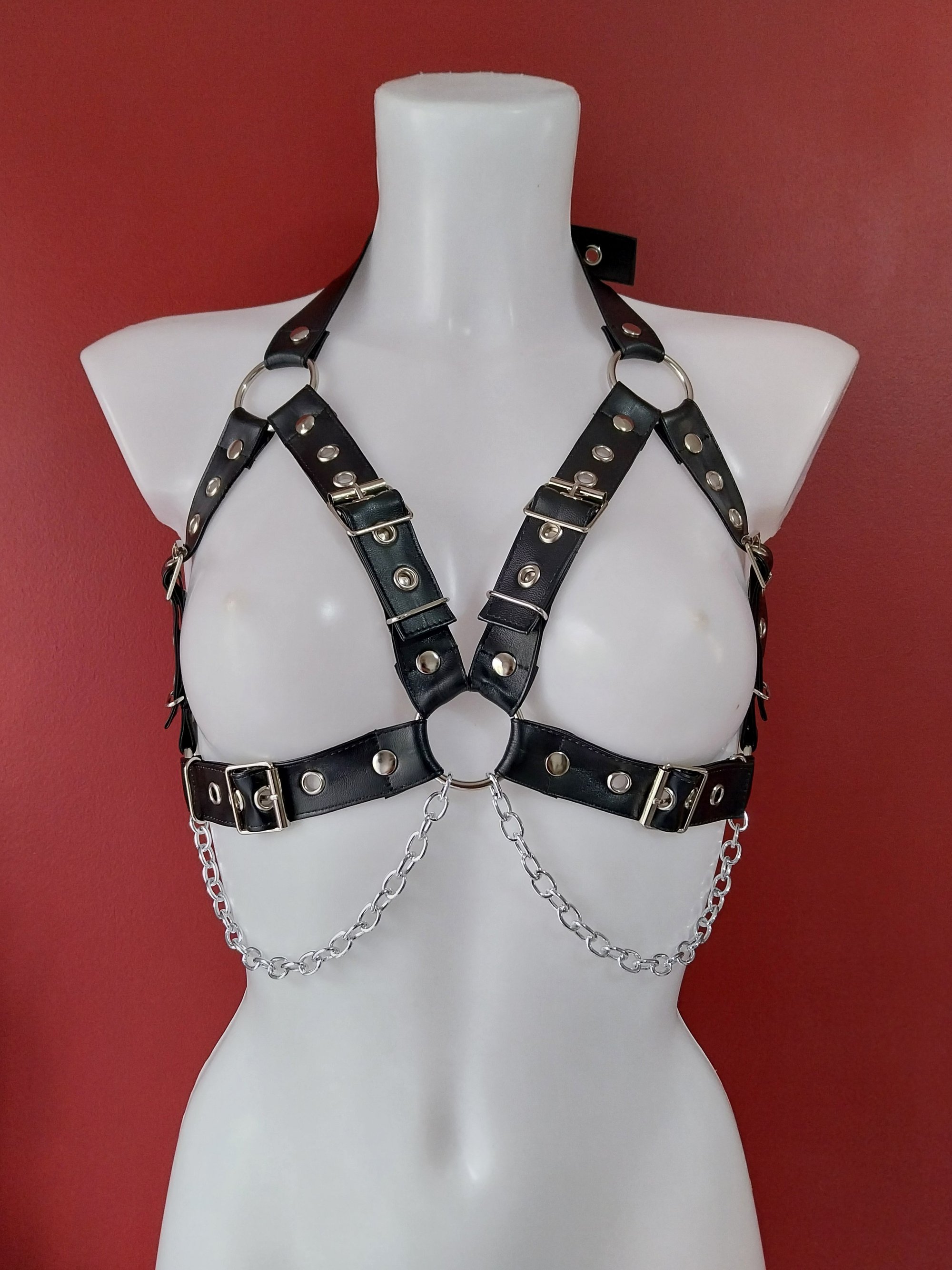Faux leather harness with silver coloured hardware including chains.