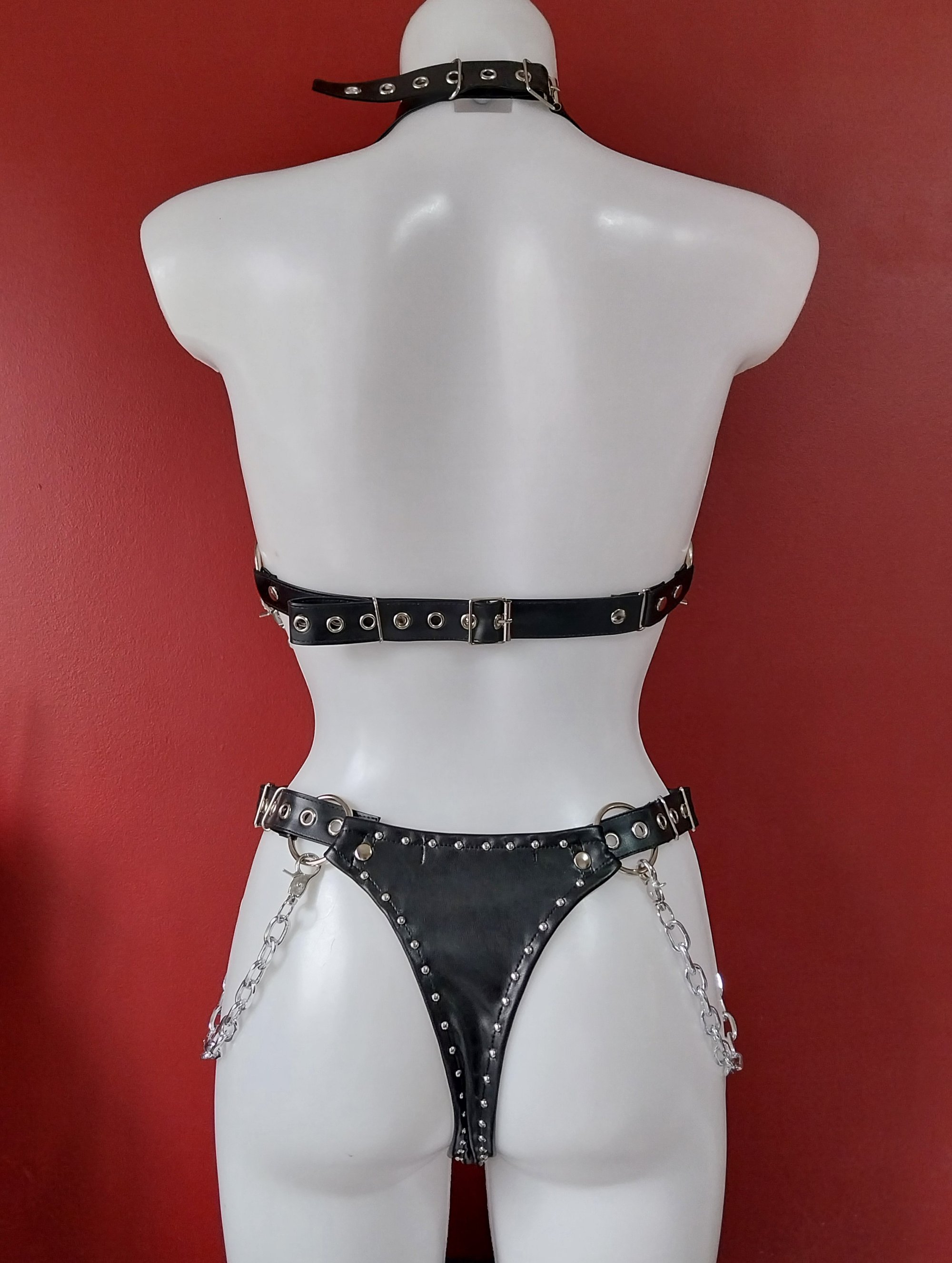 Black faux leather thong. Adjustable buckle straps and removable chains.