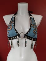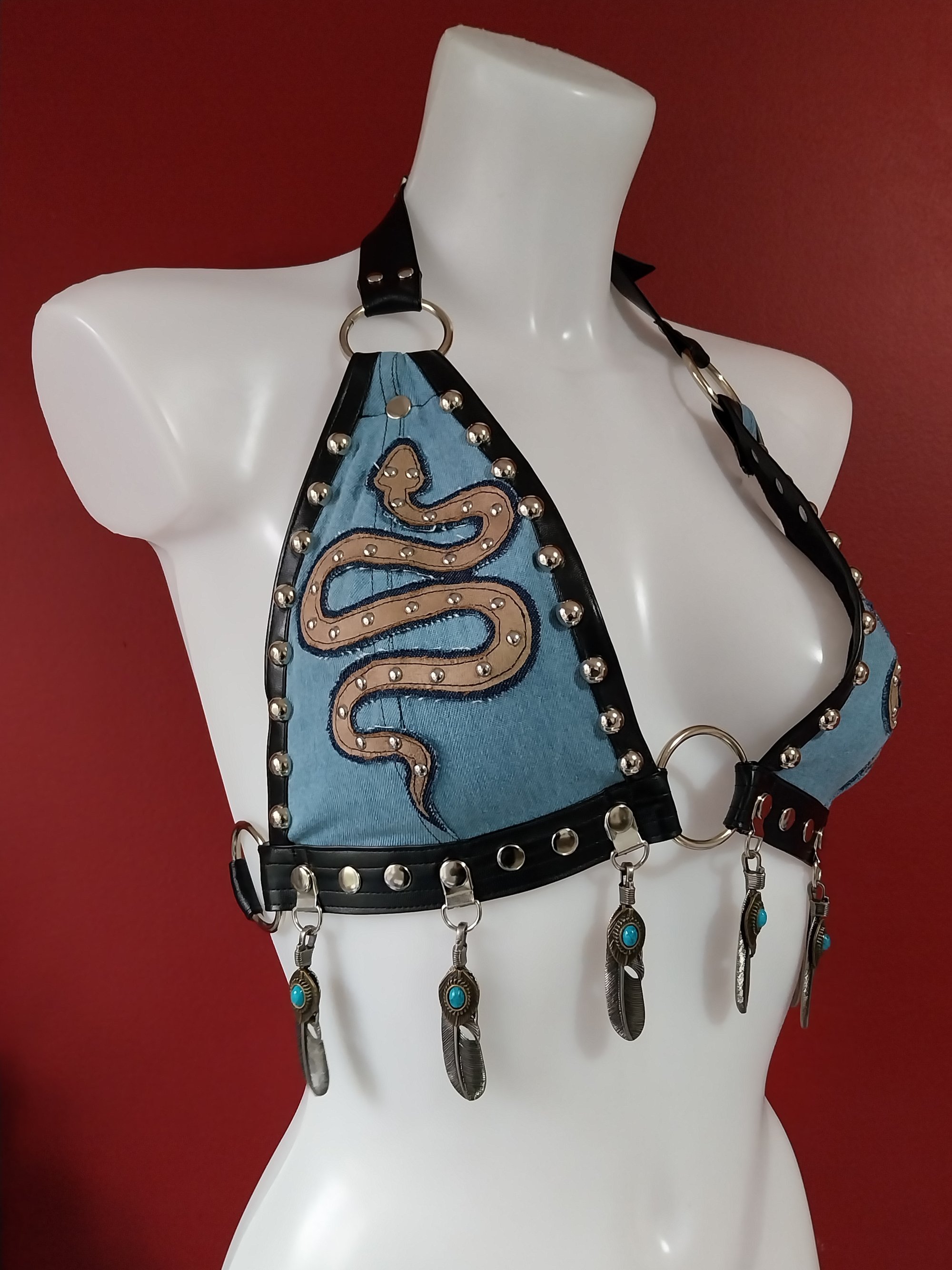 Blue denim bralette with tan faux-suede appliqué snakes, black faux leather trim and silver hardware detailing including 6 feather charms.